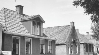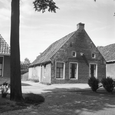 Eenvoudige woning onder zadeldak met voorschild en topschoorsteen. Zesruitsvensters.