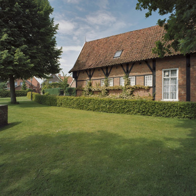 Huis met zijgevel van vakwerk en houten inrijpoort aan de korte zijde, 1698.