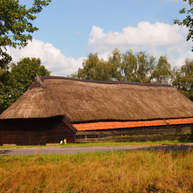 Langgerekte schaapskooi met houten wanden en rietdekking met een druipstrook met pannen belegd.