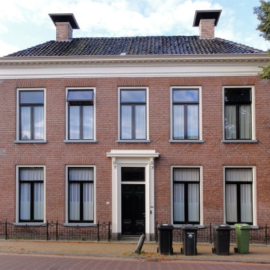 Woonhuis met verdieping onder zadeldak tegen topgevel met aanzetlijstjes, beitelingen langs de zijden en houten deklijsten.