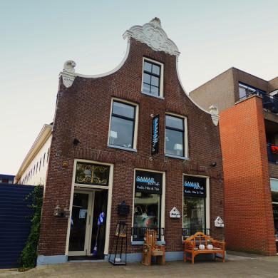 Pand met zadeldak tegen halsgevel met rijk gebeeldhouwde klauwstukken en bekroning in de Friese Lodewijk XIV-stijl.