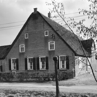 BOERDERIJ ca. 1800, met rieten zadeldak, puntgevel met vlechtingen, links een uitbouw onder pannen zadeldak en in de rechter zijgevel baanderdeuren onder rieten dakkapel met houten puntgevel.