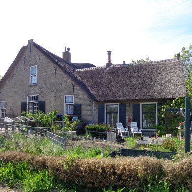 BOERDERIJ ca. 1800, met rieten zadeldak, puntgevel met vlechtingen, links een uitbouw onder pannen zadeldak en in de rechter zijgevel baanderdeuren onder rieten dakkapel met houten puntgevel.