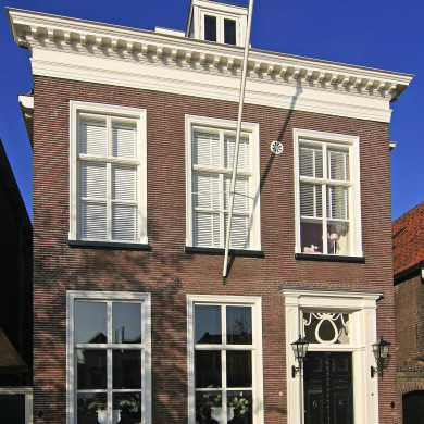 Pand van parterre en verdieping onder schilddak met topschoorsteen. Eenvoudige lijstgevel (XIXa) van drie vensterassen, waarvan de linker, die de ingangspartij bevat, als risaliet is opgevat. Deur en bovenlicht geflankeerd door gecanneleerde pilasters; gestoken deurkalf.