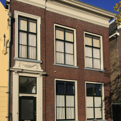 Pand achter tot puntgevel gewijzigde en gepleisterde trapgevel van het Dordtse type (XVII A) met in de verdieping geprofileerde ontlastingsbogen, die zich tootvormig ontwikkelen uit de op gebeeldhouwde koppen rustende muurstijlen. Sierankers. Onderpui met bossagewerk XIXc.