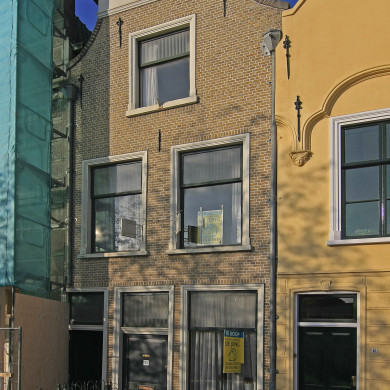 Pand achter tot puntgevel gewijzigde en gepleisterde trapgevel van het Dordtse type (XVII A) met in de verdieping geprofileerde ontlastingsbogen, die zich tootvormig ontwikkelen uit de op gebeeldhouwde koppen rustende muurstijlen. Sierankers. Onderpui met bossagewerk XIXc.