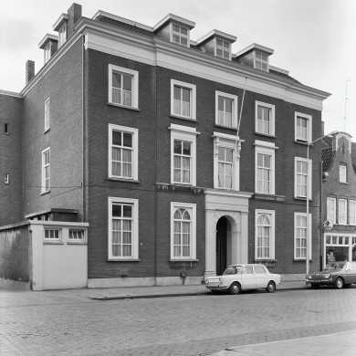 Klassicistisch herenhuis uit het midden van de vorige eeuw, met geprofileerde kroonlijst, risalerende middenpartij van de gevel, ingang met pilasters en boog, te weerszijden van de ingang vensters met waaierzwikken, voorts acht-, zes- en vierdelige schuiframen, het middenvenster benadrukt door een kroonlijst op voluten.