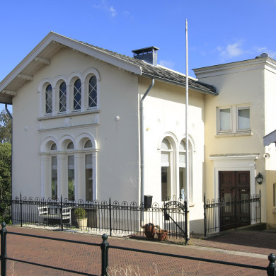 Gaaf bewaard dwarshuis uit het midden van de 19e eeuw onder pannen zadeldak, waarin dakkapellen met frontons en vleugelstukken. Deur met gestoken kalf en bovenlicht binnen een omlijsting van pilasters met hoofdgestel. Vensters met zesruitsschuiframen.