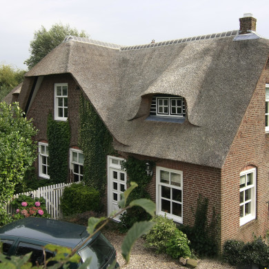 Boerderij uit de 18e eeuw onder rieten wolfdak. Uitgebouwde opkamer. In de voorgevel vlechtingen en stermotieven in het metselwerk. Sieranker. Vensters met luiken en zesruitsschuiframen. Recht op het erf een houten schuur met pannen zadeldak.