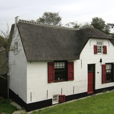Boerderij uit de 17e of 18e eeuw onder rieten wolfdak. Gepleisterde muren links en uitgebouwde zijkamer. Sieranker; vensters met luiken en schuiframen met zes-,negen- en zestienruitsroedenverdeling.