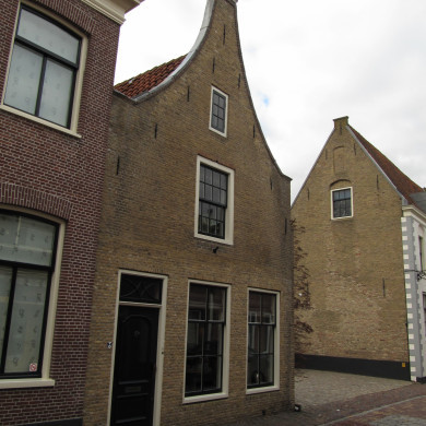 PAND met tot klokgevel gewijzigde trapgevel, 17e eeuw. Klein topfronton.