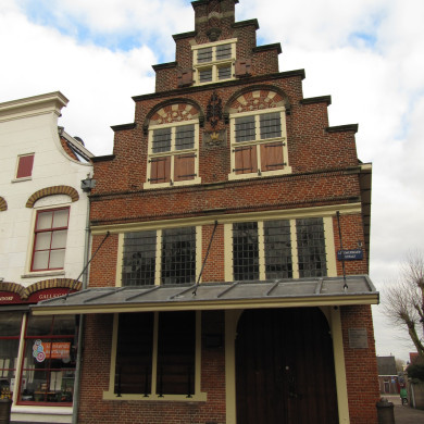 WAAG. HOEKPAND met renaissancetrapgevel uit 1595, ingrijpend hersteld en gereconstrueerd in 1938. Geprofileerde ontlastingsbogen op consoles, gevuld met vlechtwerk; kruiskozijnen met luikjes en versierde toppilaster op gebeeldhouwde maskerkraagsteen.