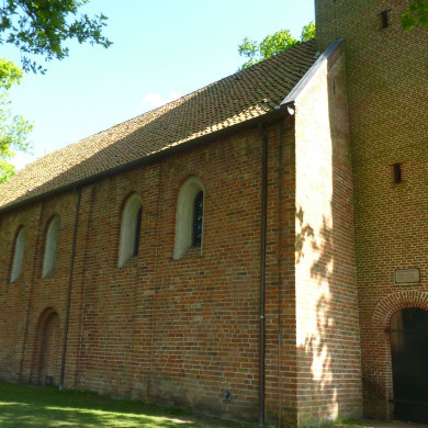 Met eiken beplant en door vijftiende eeuws of later keermuurtje afgezet iets verhoogd kerkhof zonder zerken, behorende bij de in aanleg dertiende eeuwse N.N. kerk.