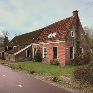Boerderij, 18e eeuw. Woonhuis door vlechtingen versierde puntgevel en zesruitsramen. Stal met door pannen en riet gedekt dak en zijbaander.