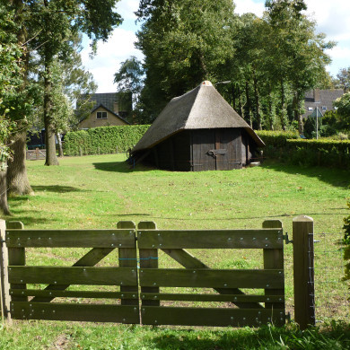 Nabij de boerderij Groot Hussel op de hoek van de Stationsweg en de Husselsteeg een mooie schaapskooi met rieten dak.