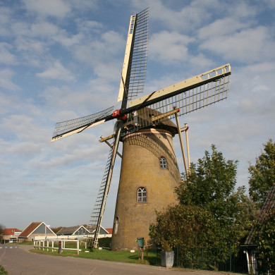 KORENMOLEN 'De Lelie'. Witgepleisterde, rond gemetselde grondzeiler uit 1836.