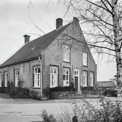 Pand, blijkens een gevelsteen uit 1787, maar in de 19e eeuw verbouwd. Aan de voorzijde afgeknotte puntgevel met vlechtingen en houten kroonlijst. Boven de deur een hardstenen plaat met opschrift: "Fransch Nederduitsch Schoolhuis, 1787". Vensters met acht- en zesruitsschuiframen.