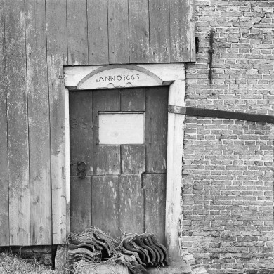 Friese schuur in 1663 over de boerderij de Leare heengebouwd; jaartal boven ingangsdeurtje in de houten schuurgevel.