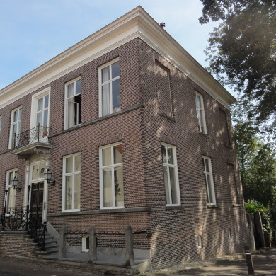 Bakstenen huis op vierkante plattegrond, bestaande uit kelder, bel-etage en verdieping, onder schilddak. In de voorgevel deurpartij met omlijsting, stoep met bordes en balkon met gietijzeren hekwerk, openslaande vensters.