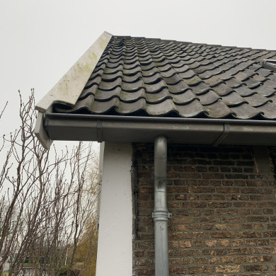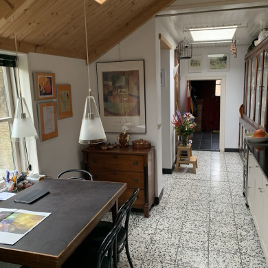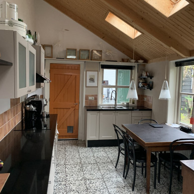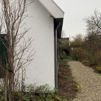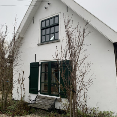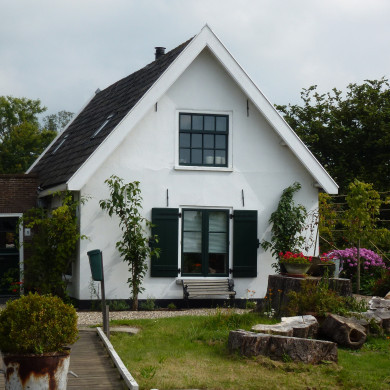 Gepleisterd huisje onder zadeldak, omstreeks 1800. Vensters met zes- en negenruitsschuiframen in de zijgevel.
