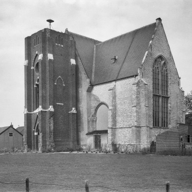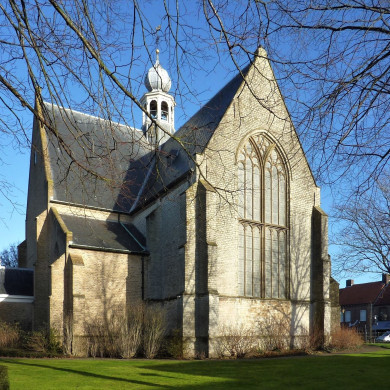 Restant van middeleeuwse gotische kerk, waarvan het schip in 1532 verbrand is, en de toren in 1821 gesloopt. Het bewaard gebleven koorgedeelte stamt uit de tweede helft van de 15e eeuw. Geheel met ledesteen bekleed. Gewelfde sacristie met verdieping. In de oostwand poortje met memoriesteen, 1603, geflankeerd op de belendende steunberen door schilddragende leeuwtjes.