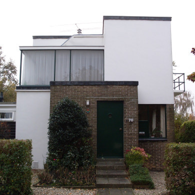 Het is samengesteld uit cubische bouwvolumes, elk plat afgedekt en voorzien van een zwarte tegelsierlijst langs de bovenrand, met een maximale bouwhoogte van twee bouwlagen, opgetrokken in baksteen, waarbij de bovenbouw witgepleisterde muren bezit, op een rechthoekige grondslag; de muren worden doorbroken door in smalle stalen kozijnen gevatte vensters met dito vertikale onderverdeling en nu eens gekoppeld, dan weer individueel in de gevels geplaatst en met een op een vaste maat-verhouding gebaseerd formaat, afwisselend een horizontale en een verticale rechthoek. De hoofdingang - een stalen deur met klein cirkel-venster - met lage stoep bevindt zich in het midden van de ZO-gevel, waartoe een apart portaal is uitgebouwd; links hiervan bevindt zich het trappenhuis dat op de verdieping van een lichtkap is voorzien met een grote, om de hoek omgezette vensterstrook, en dat op bijna halverhoogte van de verdieping eindigt, met een teruggerooide, afgeschuinde top, terwijl het vrijwel blinde rechterblok daarbovenuit torent. De lange ZW-gevel bevat beneden een drietal vensters waarvan het rechter een horizontaal bovenlicht is, en op de verdieping links een buiten de gevel uitstekend balcon met betonvloer en stalen buisleuning, met alleen in het midden een horizontaal bovenlicht. De korte NW-gevel bevat beneden in het midden een tuindeur met vensters te weerszijden en op de verdieping links een grote vensterstrook en rechts een uitstekend balcon met betonnen vloer en stalen buisleuning, omgezet om de NO-hoek. De lange NO-gevel bevat links beneden grote vensterstroken; de zij-ingang rechts is thans aan het gezicht onttrokken door een latere aanbouw - het verbindingslid met nr. 72 - op de verdieping in het midden en rechts een tweetal vensters.