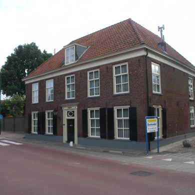 Boerderij naast de kerk met hoog dwarshuis 1817, zadeldak in topgevels eindigend.