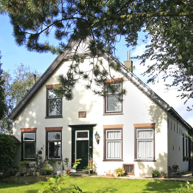BOERDERIJ met dwars woonhuis, waarachter een hoge stal. Van het door een pannen zadeldak gedekte woonhuis dateert de achterste helft uit de 17e eeuw, terwijl de voorzijde vernieuwd is in het tweede kwart van de 19e eeuw.