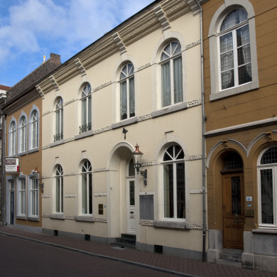 Huis met gepleisterde, rijk geornamenteerde lijstgevel, midden XIX, voorzien van plintpanelen met diamantkoppen.