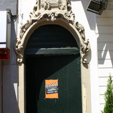 Poortje met zandstenen boog en versiering in Lodewijk XV-stijl, in een cartouche een reliëf voorstellende een wijnvat met kinderfiguren. Omstreeks 1780.
