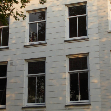 Koopmanshuis, eerste kwart 18e eeuw, met gebosseerde natuurstenen lijstgevel en vensters met acht- en zesruitsschuiframen in Empire-trant.