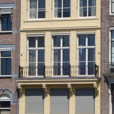 Koopmanshuis met gepleisterde lijstgevel en hardstenen onderpui. 18e eeuws; gevel van karakter derde kwart 19e eeuw.