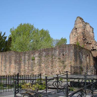 Slotruine. Op het kerkhof het overblijfsel van 13e eeuwse kasteeltoren.