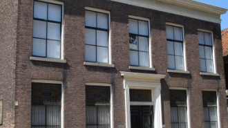Veerhuis van Delft. Gepleisterd gebouw met hoog schilddak en wapensteen met jaartal: 1767.