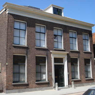 Veerhuis van Delft. Gepleisterd gebouw met hoog schilddak en wapensteen met jaartal: 1767.