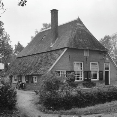 Boerderij "Heikamp" (XIX A) met strodak, oude roedenverdeling, luiken en een achterbaander.