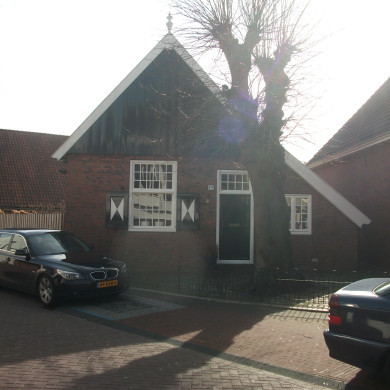 Eenvoudig pand met houten topgevel, vensters met roedeverdeling; het grootste met halve luiken behangen.