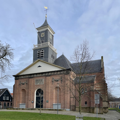 Pand met halve verdieping en gedekt door schilddak met hoekschoorstenen. Lijstgevel, voordeuromlijsting. Rechts een lange verdiepingloze aanbouw met in de smalle gevel brede ingang. Links een korter aanbouwtje van gelijke nokhoogte. XIX A.