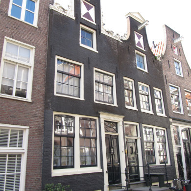 Pand met halsgevel, verwant met het "doorboordebloem-type" (plm 1700/XVIIIa). Deuromlijsting en snijraam (XIXa). Goede roedenverdeling.