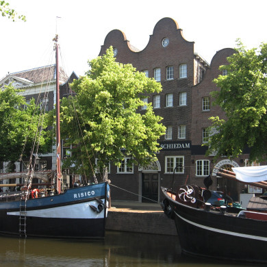 Als dubbel PAKHUIS met vier bouwlagen onder twee pannen schilddaken in baksteen opgetrokken branderijgebouw, blijkens sluitsteen in de poortboog daterend uit 1794.