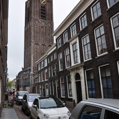 Waag. Tegen de toren der Grote Kerk in 1748 opgetrokken waaggebouwtje met segmentvormige gevelbekroning een eenvoudige ingangspartij in Lod. XIV-vormen.