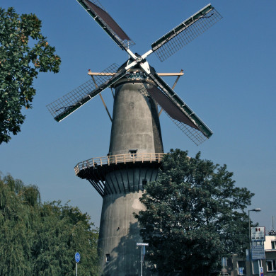 "De drie koornbloemen". Monumentale, bakstenen stellingmolen met zeer hoge, conische romp. Aan de oostzijde mooie gevelsteen met opschrift en jaartal: 1770.