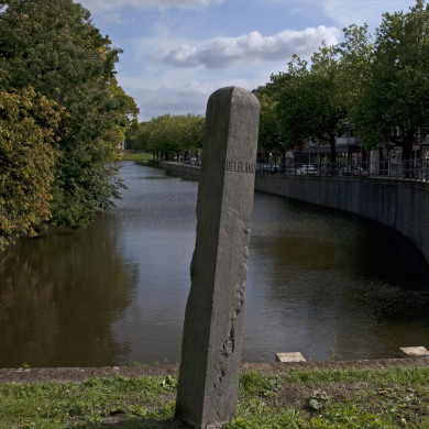 Grenspaal in het plantsoen Vlaardingerdijk, einde Korte Haven zich bevindende op het grondgebied van de gemeente Schiedam, doch eigendom van het Hoogheemraadschap Delfland en Schieland.