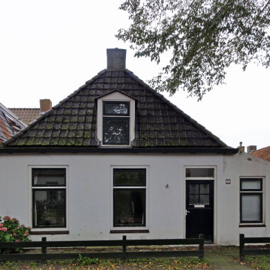 Pand onder zadeldak, voorzijde afgewolfd, houten goot op blokjes.