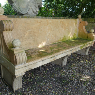 BANK. Terracotta bank (1e kwart 20e eeuw) op drie voeten, voorzien van "armleuningen" met voluten en bollen en geplaatst in de boventuin bij het oostelijke uiteinde van de keermuur in de grote moestuin.