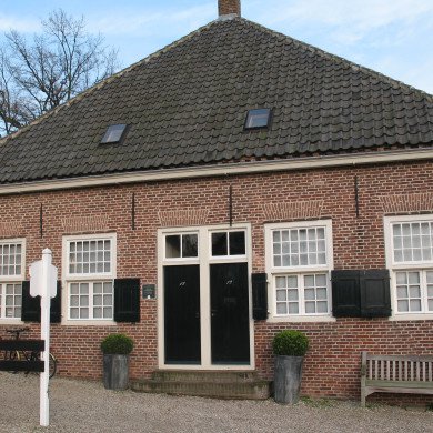 KOETSIERSHUIS MET POMP. Langgerekt pand onder schilddak met dakkapel (4e kwart 17e eeuw, later gewijzigd en verlengd), in de voorgevel aan de oprijweg blijkens de nog aanwezige strekken oorspronkelijk voorzien van vijf smalle vensters en deur(en), waarschijnlijk spoedig na de bouw vervangen door bredere schuifvensters met vast bovendeel en kleine roedenverdeling en twee gekoppelde deuren; in de zijgevel aan de Drostestraat drie soortgelijke vensters en drie kleinere.