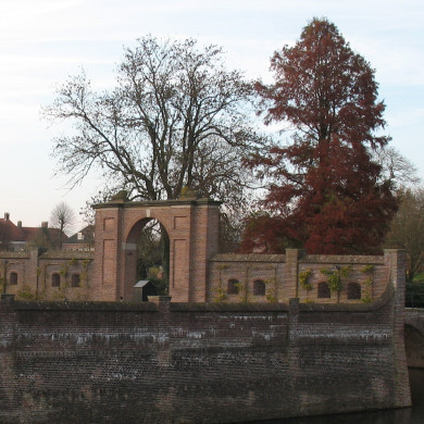 Poort, in het laatste kwart van de 19e of het eerste kwart van de 20e eeuw gevormd uit twee vierkante bakstenen hekpijlers met rechthoekige en vierkante, verdiepte velden en natuurstenen afdekplaten (4e kwart 17e eeuw) en een verbindende boog in 17e-eeuwse stijl; smeedijzeren hekvleugels, tot deuren gemaakt door een tweezijdige bekleding met planken. Bekronende liggende natuurstenen leeuwen uit de tijd van de verbouwing tot poort.