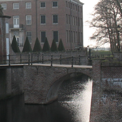 De in de boogkruin 1673 gedateerde, van ijzeren balusterleuningen voorziene brug is na 1879 ter verhoging van het "verdedigbare" effect ingekort tot enkele meters voor het voorplein; bij die gelegenheid is tussen de boogbrug en het voorplein een houten brug gespannen.