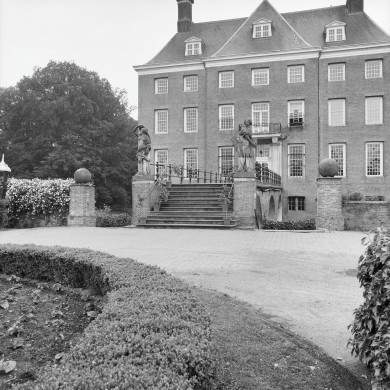 MUREN EN TRAPPEN MET BEELDEN EN BOLLEN VAN HET VOORPLEIN. Rondom het voorplein bakstenen walmuren (aan de noordzijde) en keermuren (aan de west- en zuidzijde), in oorsprong nog daterende van voor de verwoesting van het kasteel in 1673, waarin aan de noord- en westzijde toegangen naar een kelder onder het voorplein.