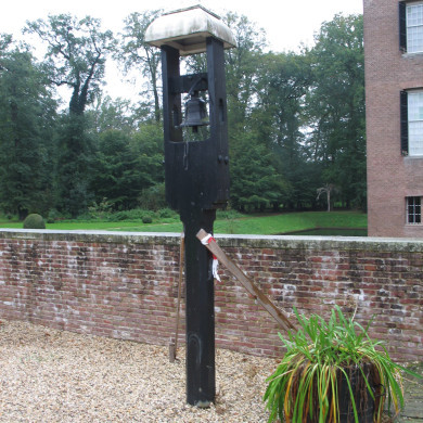 KLOKKENSTOEL MET BEL. Op het voorplein links van de trappen een houten klokkenstoel in de vorm van een paal met uit- en ingezwenkte overhuiving, waarschijnlijk gemaakt voor de erin hangende bel die het opschrift draagt SOLI DEO GLORIA - Ao 1728.